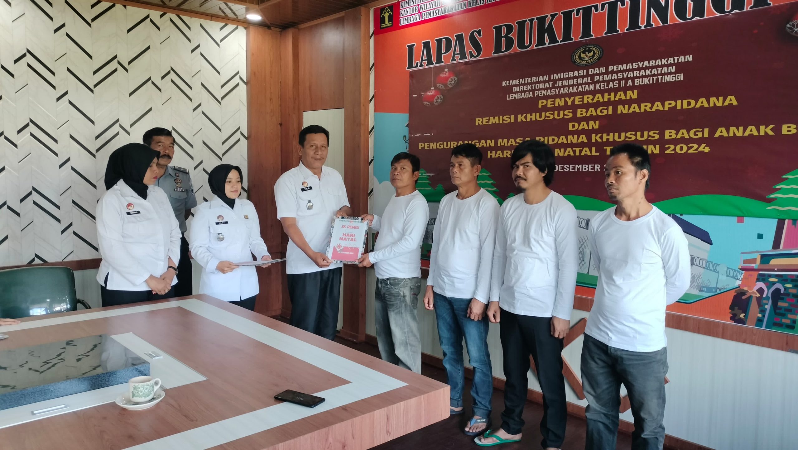 Rabu (25/12/2024)~Dalam rangka merayakan Hari Natal Tahun 2024, Sebanyak 4 orang warga binaan di Lembaga Pemasyarakatan Kelas IIA Bukittinggi menerima remisi Natal, pemberian Remisi Khusus hari Raya Natal Tahun 2024 di lakukan secara serentak seluruh indonesia melalui zoom yang di pusatkan di LPP Bandung bersama Menteri Imigrasi dan Pemasyarakatan Bapak Agus Andrianto.