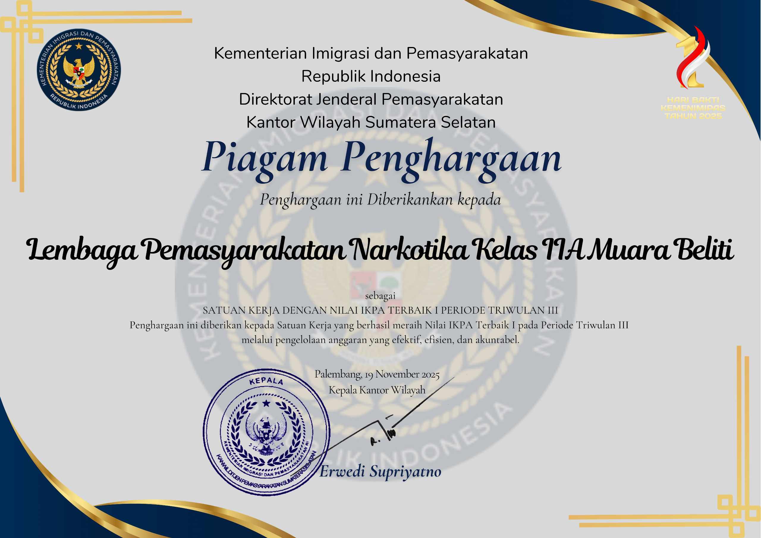 Penghargaan ini diterima langsung oleh Kalapas Narkotika Muara Beliti,sebagai bentuk apresiasi atas komitmen dan kinerja optimal jajaran dalam memastikan pengelolaan anggaran berjalan sesuai prinsip tata kelola pemerintahan yang baik. Nilai IKPA yang tinggi menunjukkan bahwa Lapas Narkotika Muara Beliti mampu melaksanakan pengelolaan anggaran secara tepat waktu, tepat sasaran, serta memenuhi seluruh aspek akuntabilitas yang ditetapkan pemerintah.