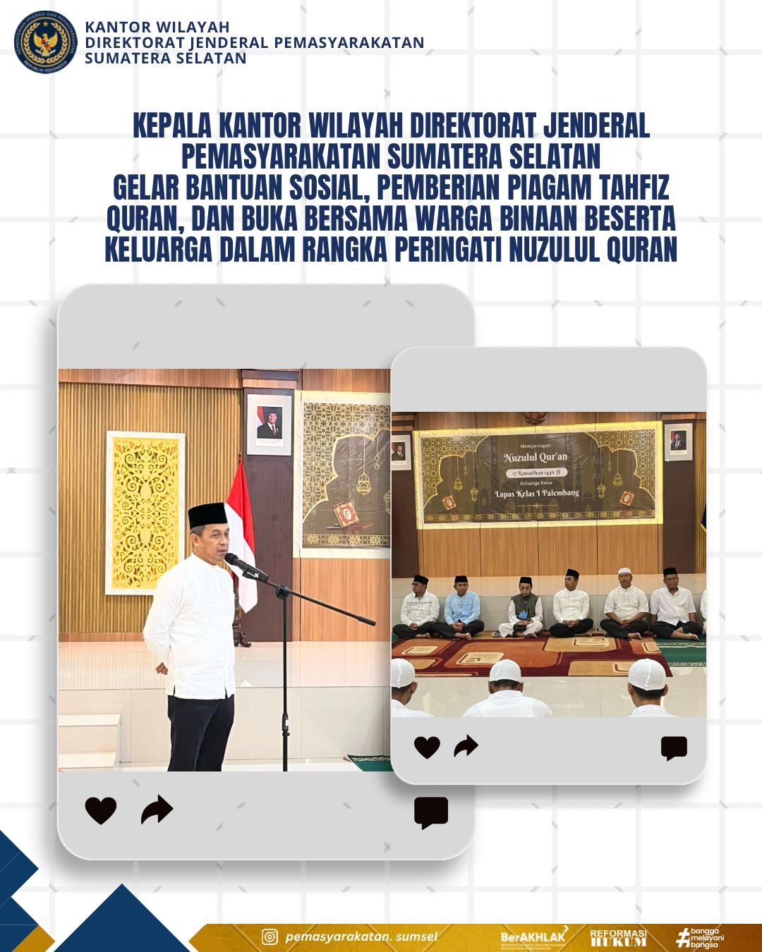Palembang, 17 Maret 2025 bertempat di Lembaga Pemasyarakatan Kelas I Palembang. Dalam rangka memperingati Nuzulul Quran, Kepala Kantor Wilayah Direktorat Jenderal Pemasyarakatan Sumatera Selatan, Erwedi Supriyatno, menggelar acara sosial yang melibatkan warga binaan dan keluarga warga binaan pemasyarakatan. Acara tersebut bertujuan untuk mendukung 13 program menteri imigrasi dan pemasyarakatan, mempererat tali silaturahmi dan mendukung program pembinaan kepribadian warga binaan