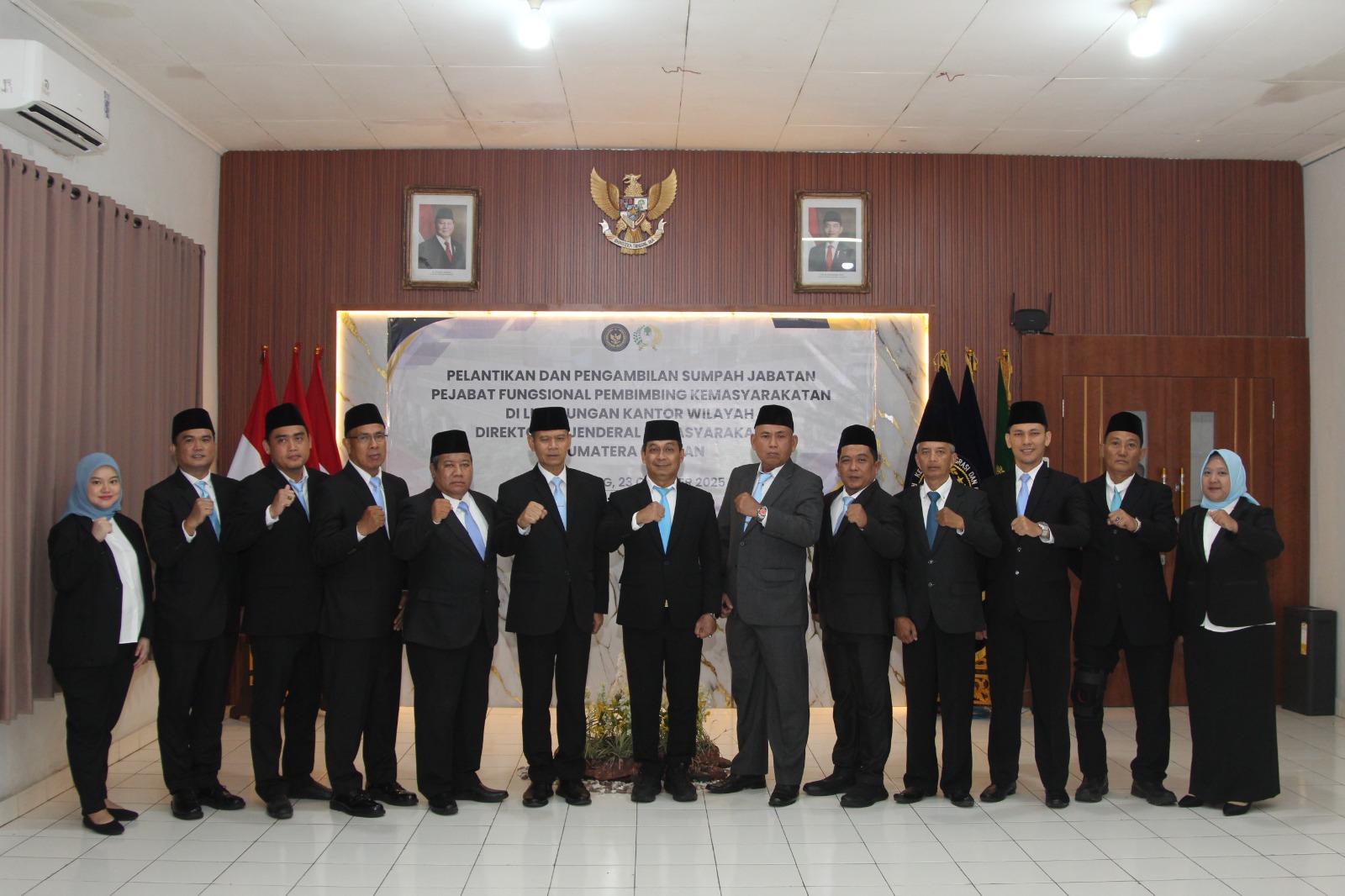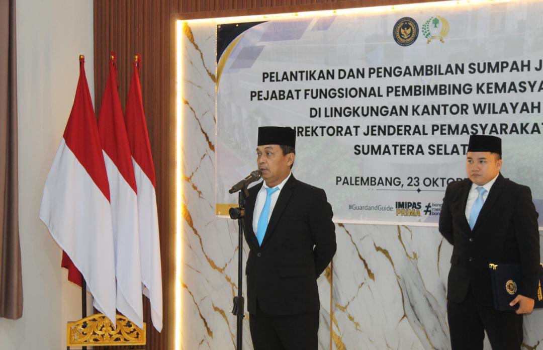 Palembang, 23 Oktober 2025 – Kantor Wilayah Direktorat Jenderal Pemasyarakatan Sumatera Selatan menggelar Upacara Pelantikan dan Pengambilan Sumpah Jabatan Pejabat Fungsional Pembimbing Kemasyarakatan bertempat di Aula Kanwil Ditjenpas Sumsel.