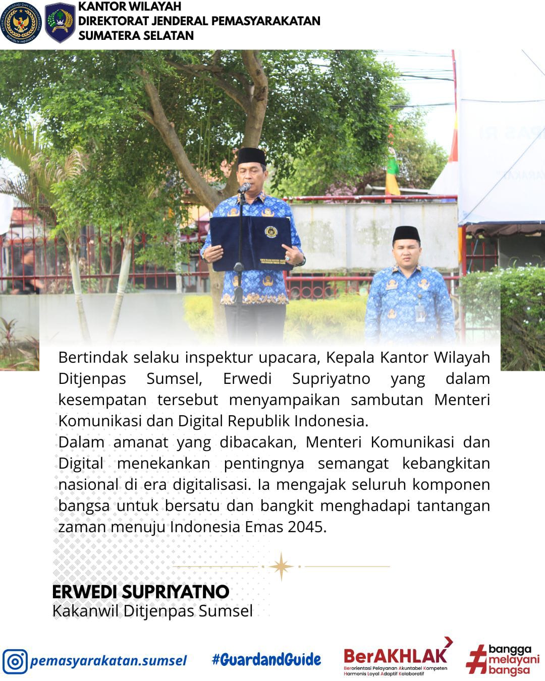 Upacara berlangsung dengan khidmat dan diikuti oleh para pejabat serta jajaran Kanwil Ditjenpas Sumsel. Bertindak selaku inspektur upacara, Kepala Kantor Wilayah Ditjenpas Sumsel, Erwedi Supriyatno yang dalam kesempatan tersebut menyampaikan sambutan Menteri Komunikasi dan Digital Republik Indonesia.