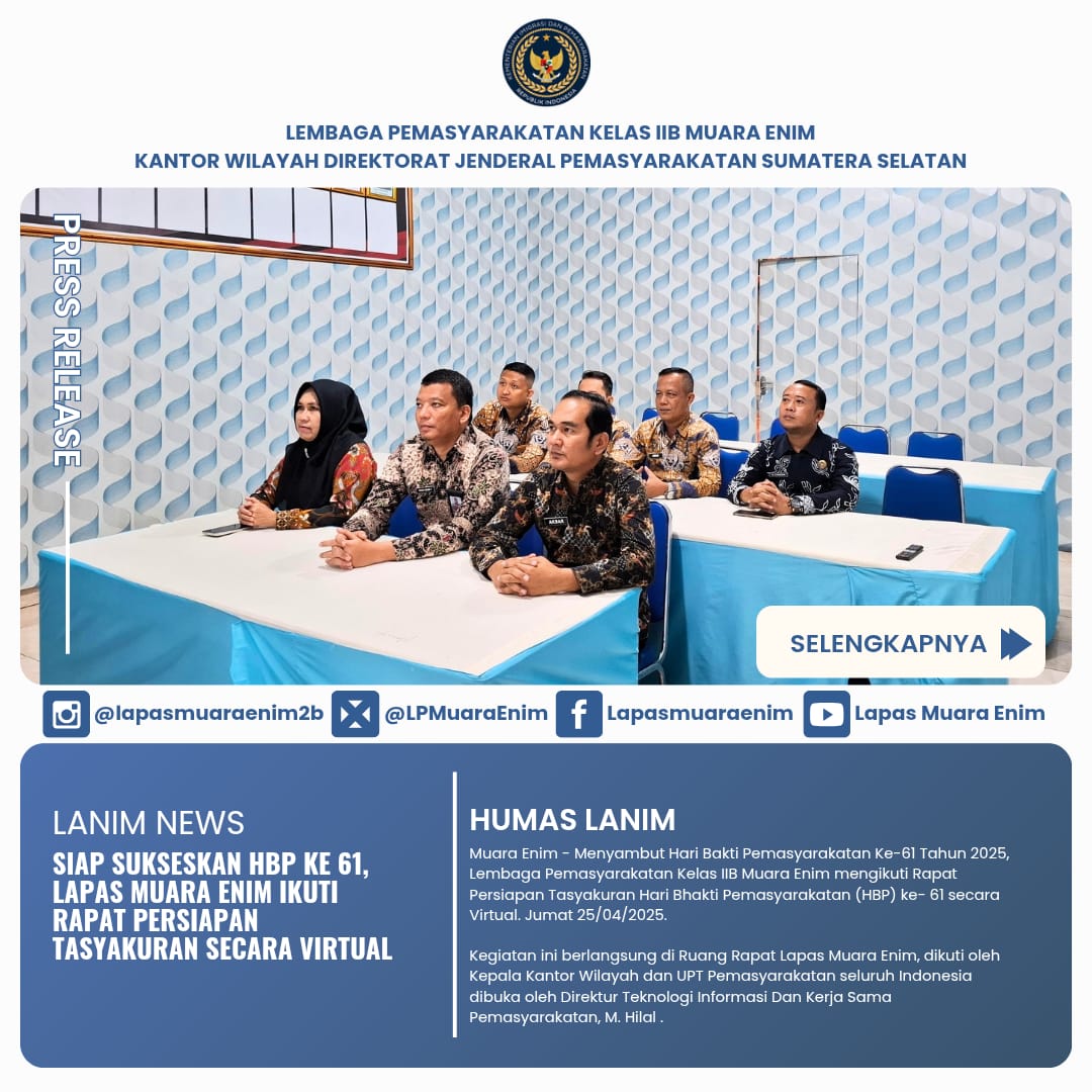 Muara Enim – Menyambut Hari Bakti Pemasyarakatan Ke-61 Tahun 2025, Lembaga Pemasyarakatan Kelas IIB Muara Enim mengikuti Rapat Persiapan Tasyakuran Hari Bhakti Pemasyarakatan (HBP) ke- 61 secara Virtual. Jumat 25/04/2025.